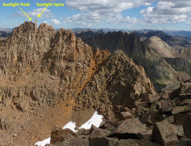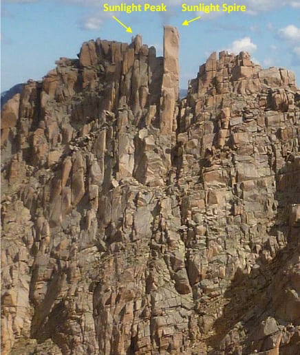 Sunlight Spire bears mentioning. It looks taller than Sunlight Peak (14,066’) but it’s not. Before the rechecking of all mountain heights in Colorado which were found to be 7’ higher than before known, Sunlight Spire was 13,993’. Now it is a 14er at exactly 14,000’. Fortunately it doesn’t qualify as a 14er because the low point from it to Sunlight isn’t much of a dip. I say fortunately because just look at it. The Sprire is a Class 5-10 highly-technical climb with just a jamcrack to get the last 40’ to it’s summit and it is overhung 4%. Andy Mishmash is the only guy I know personally who’s done it.