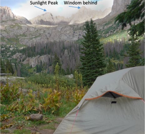 Our camp looked right up at Sunlight and Windom (actually more like the false summit, Windom is hiding behind).