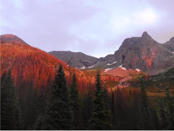 This shot is striking because of end-of-the-day sun, but the sadness is that the red trees are alpenglow on dead pines, victims of the pine-beetle destruction.
