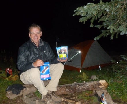 Here’s me at camp, we had to move quickly to get there – the train let us off at 3:40pm and since it’s late August, we lose the daylight at 8:15pm so backpacking 4 hours would get us to our favorite camp position with a ½ hour to set up tents, string up our food (keep from the bears at night), fill up with filtered water from the creek, pour the wine and heat water for our dehydrated food. We like the Mountain House spaghetti and meat balls, but we ran out so I had the Lasagna which was ok. I’m holding a new idea – dehydrated ice-cream bars for dessert – yum!