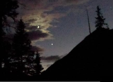 Those of you who read my Little Bear climb (the most dangerous 14er) know that 2 years ago I’d gotten a gift to consult with a Chinese astrologer. Among many things he said the planet Venus would look over me for 14 years (!!) and make things good. Now that’s my kind of prediction, and sure enough, as with Little Bear, this night there was the moon and VENUS. I took that to mean this time, the 4th attempt, was going to be a success.