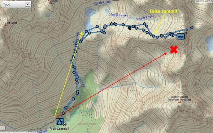 The red-arrow path on the map starts at the Needleton train drop-off and follows the Needle Creek six miles into the basin. From there the climbs all entail hiking first up to Twin Lakes and then the yellow arrows show the basic direction to each of the 14ers. The blue dots are our actual route to Windom summit from camp.