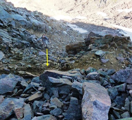 Then you swing around to the left until you see a gully leading up to a narrow saddle that has nothing on the other side. There’s no cairns here, or in places there are too many cairns in too many directions. We climbed up the gully and turned left just before the saddle.